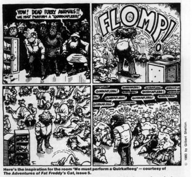 The humour became wilder. Some of the names for the rooms are obscure to the point of perversity. Was it true that 'We must perform a Quirkafleeg' derives from a cartoon in that comic beloved of hippies, The Furry Freak Brothers? "Yes" says Matthew. "I've been reading those comics for years, Furry Freak, and Fat Freddy's Cat. So does Alan."